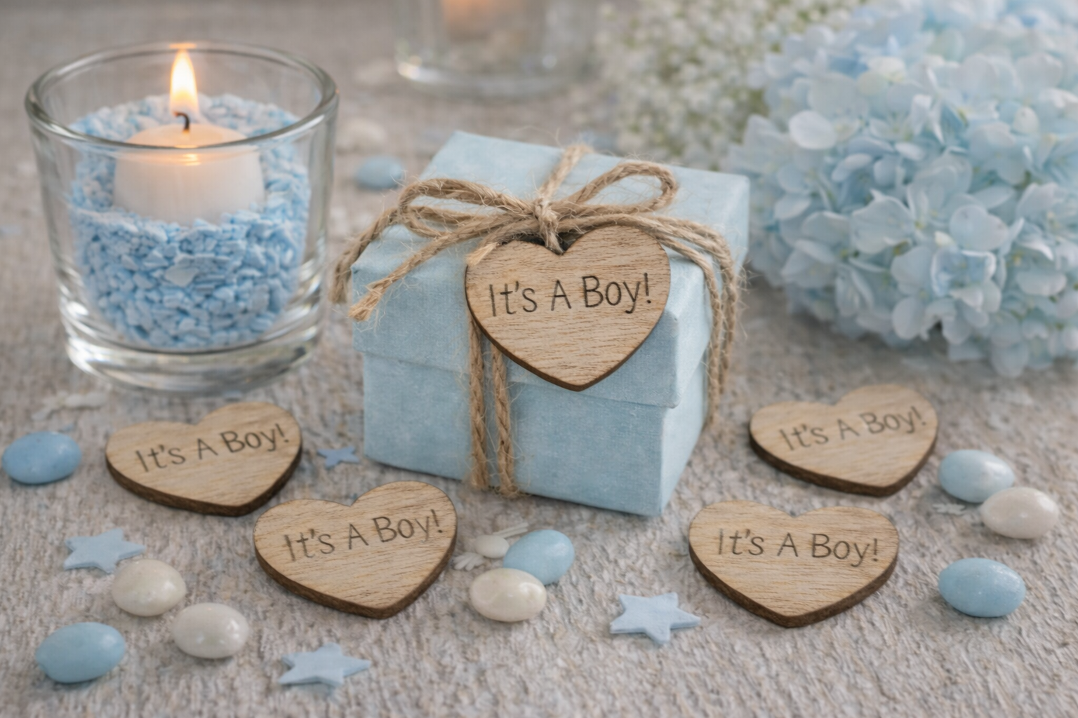 Celebrate a baby shower in rustic style with this pack of 100 laser-engraved “It’s a Boy” wood hearts. Each heart measures approx. 1 inch wide and 7/8 inch tall and 1/16th inch thick and is perfect for table scatter, party favors, card making, and nursery decor.