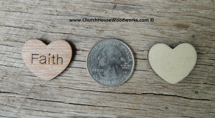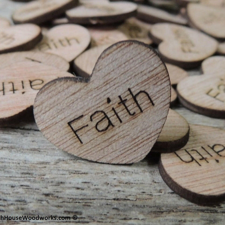 You will receive 100 Small Wooden Engraved "Faith" Hearts. Perfect for scattering around a guest book or other wedding decor. Dimensions are approx 1" wide x 7/8" tall x 1/16 inch thick. These would make a great addition to any rustic barn wedding, event, or bridal shower.